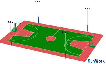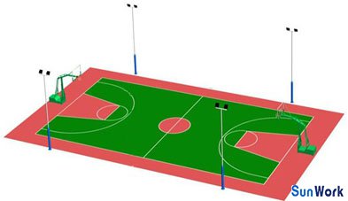 下面以室外籃球場為例簡單介紹一般室外籃球場照明方案所選燈型及布燈方式: