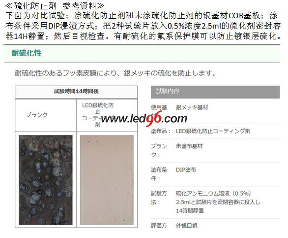 COB光源由于其優(yōu)越的性能表現(xiàn)在LED照明產(chǎn)業(yè)得到廣泛的應(yīng)用;但COB光源有個(gè)令人頭疼的問(wèn)題;就是COB光源高反射鍍銀基板在使用過(guò)程中;銀層會(huì)硫化發(fā)黑;導(dǎo)致光衰嚴(yán)重;如何解決這個(gè)技術(shù)難題;目前業(yè)界還在做各種測(cè)試;日本LED業(yè)界目前開(kāi)發(fā)了一種新型的防硫化劑技術(shù);在封裝好的COB光源表面通過(guò)浸漬方式形成一層幾微米厚的硫化保護(hù)層(另外具有防腐蝕;防潮防濕性能);來(lái)防止COB光源由于硅膠的透濕透氣導(dǎo)致外部使用環(huán)境中的硫化物侵入;產(chǎn)生高反射基板鍍銀層硫化發(fā)黑;光衰嚴(yán)重;失效和死燈的問(wèn)題。硫化試驗(yàn)結(jié)果表明;有防硫化保護(hù)涂層的和沒(méi)有保護(hù)涂層的結(jié)果截然不同。