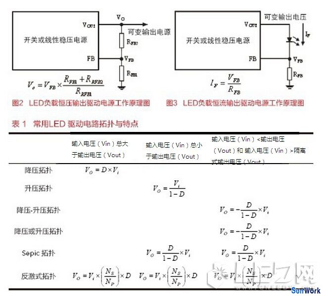 常用LED驅(qū)動電路拓?fù)渑c特點如表1所示,公式中D表示開關(guān)變換脈沖占空比。