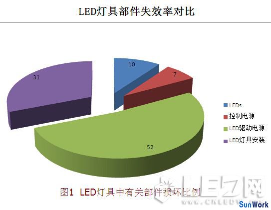 LED燈具中有關(guān)部件損壞比例如圖1所示,其中,LEDs的損壞率為10%,控制電路為7%,LED燈具的安裝為31%,LED驅(qū)動器為52%??梢娫贚ED燈具中LEDs的損壞率并不高,LED驅(qū)動電路失效率相對較高為52%,LED燈具失效90%并非來自LED(數(shù)據(jù)來源:Appalachian Lighting Systems)。該數(shù)據(jù)的統(tǒng)計條件是在5400件LED燈具中失效燈具為29具(失效率為:0.54%)的實驗條件下進(jìn)行的。